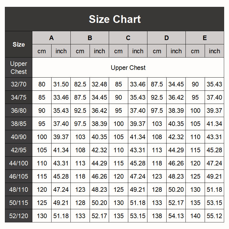 Talla: 32/70A, 32/70B, 34/75A, 34/75B, 36/80A, 36/80B, 38/85A, 38/85B, 36/80C, 38/85C, 40/90C, 42/95C