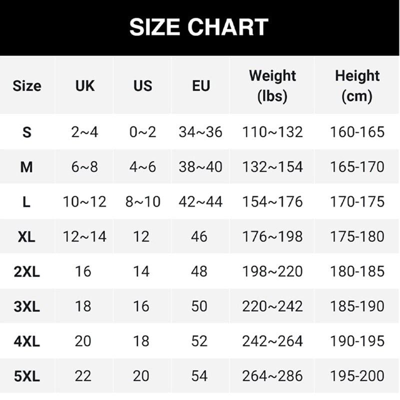 Tallas: S, M, L, XL, 2XL, 3XL, 4XL, 5XL
